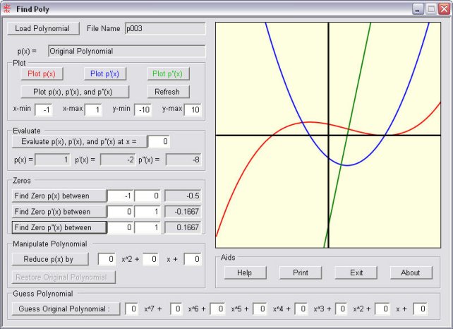 This program will answer most questions about a polynomial, except what it is. You must find the polynomial. The degree of the polynomial is less than eight, the coefficients are integers, and most of the "action" occurs between -5 and 5.