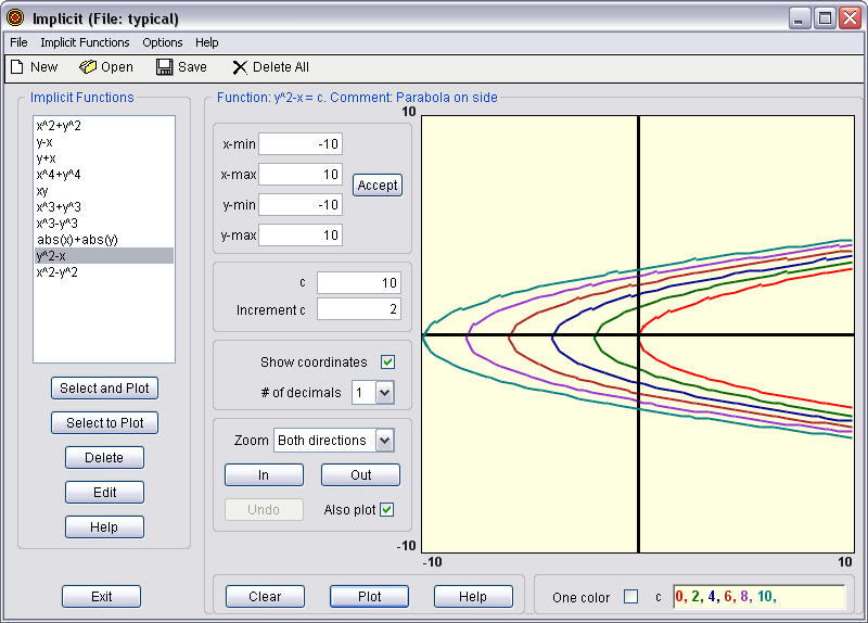 Implicit tries to plot implicit functions of the form f(x,y) = c. Thus it can be used to plot implicit functions, defined by f(x,y) = 0, together with contour lines (level surfaces) of the function z = f(x,y). (It can also be used to plot explicitly defined functions, say sin(x), by defining f(x,y) = y - sin(x), although there are better programs available to do this.)