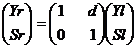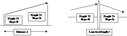 When we talk of a ray, we mean a path that is a straight line between lenses, and which can change direction when passing through a lens.  If it is at height Yl with slope Sl at the left end of an lensless interval of length d, then at the right end of that interval it will still have the same slope Sr = Sl, but the elevation will have changed by d*Sl, i.e. Yr=Yl+d*Sl.  Conversely, when a ray goes through a lens its elevation stays the same Yr=Yl, but its slope changes by an amount proportional to the elevation: Sr=Sl-Yl/f.  The quantity f is the focal length of the lens, and it is typically positive for a convex lens and negative for a concave lens (provided the index of refraction is greater than 1!).