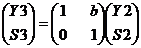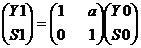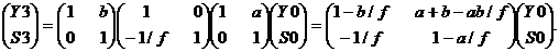 Now the way I drew it, the rays that came out of the light source converge again at a single point on the screen, in other words the height Y3 at which the rays hit the screen do not depend on the slope S0 with which they left the light source.  Looking at the multiplied-out matrix, you see that this can happen only if the upper-right entry is zero, i.e. a + b = ab/f .  You may be more familiar with this formula as  , relating the object distance a, the image distance b, and the lens focal length f .  (I started this problem imagining only a single light source, but in fact this argument applies to every single light-emitting point in a complicated real object.)  When this relation is satisfied, you can read off Y3 = (1 – b/f)Y0, which indicates that the magnification of the image is (1 – b/f) .  This factor can be either positive or negative; a negative value means that the image is inverted, i.e. upside-down.
