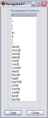The functions that the program recognizes can be seen by clicking on "View Recognized Functions and Operators" button, which displays the "Recognized Functions" window. A more detailed summary can be found here.